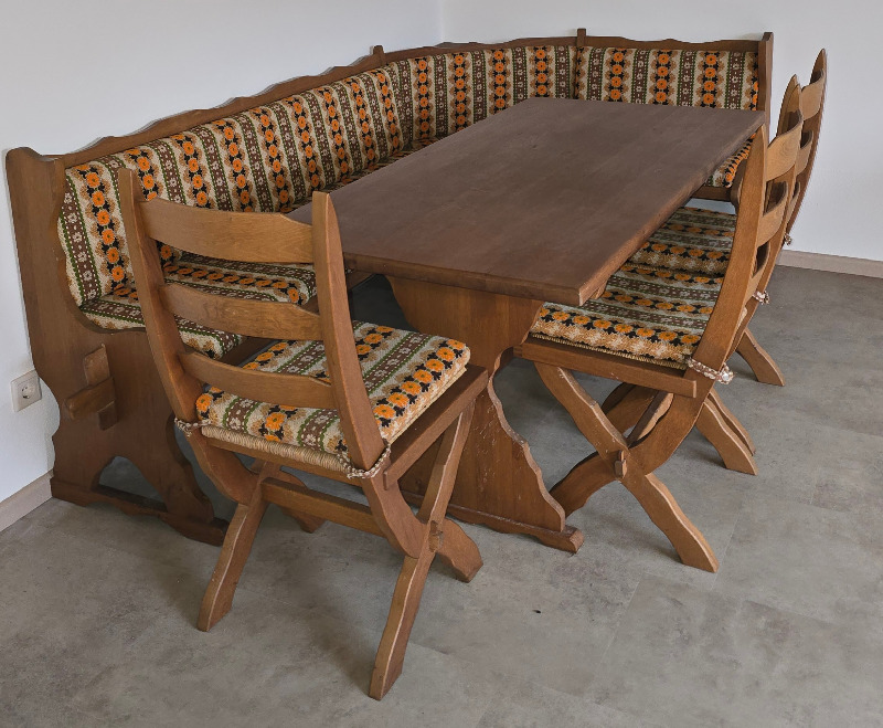 Eckbankgarnitur Massivholz, gepolstert, guter ZustandEckbank, Tisch und 3 Stühle Hausrat / Möbel Online seit 11.02.2026