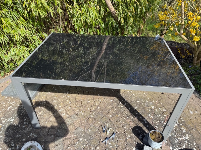 Gartenglastisch aufgebaut, Aluminiumgestell mit Glasplatte (mit kleinem kaum sichtbaren Kratzer) Maße 140 x 74 x 92 (B x H x T) Gewicht ca. 20 kg