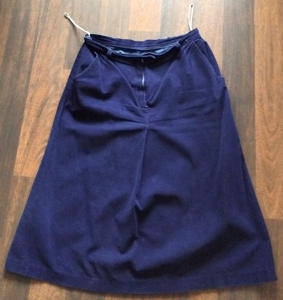 Feinsamt-Rock (100 % Baumwolle), dunkelblau, mit Seitentaschen und Gürtelschlaufen, Futter (100 % Polyester), Größe 42, zu verschenken.Auch zum "Vernähen" geeignet. Kleidung / Schuhe Online seit 26.03.2026