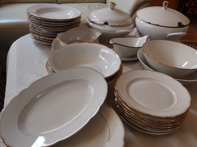 Omas bestes Festtags-Porzellan abzugeben, meist mit dem berühmten Goldrand, von deutschen Markenherstellern: 8 Kuchenteller, 12 Suppenteller, 2 Saucieres, 2 mittelgroße Schüsseln, 3 große Schüsseln, 3 mittelgroße Platten, 2 große Suppenterrinen. Weißes Porzellan von Seltmann Weiden, J. Kronester Bavaria, Celir, Rieber Mitterteich, Bareuther Bavaria oder Hch. Scherzer Bavaria; die meisten Teile mit Stempel und Nummer. Alle Teile in gebrauchtem, aber meist sehr guten Zustand, auch des Goldrandes. Nicht für Spülmaschine geeignet! Gegen 2 kg Kaffeebohnen Crema Hausrat / Möbel Online seit 24.02.2026