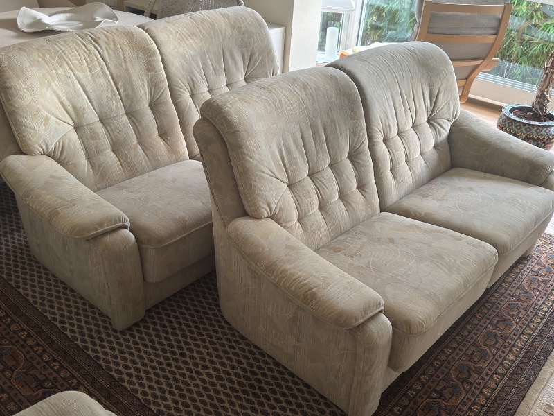 Beschreibung: Zweiteilige, gemütliche Couch abzugeben. Verbindung der beiden Teile defekt, sollte sich aber mit zwei Winkeln leicht reparieren lassen. Couch stand in Katzenhaushalt, daher nicht allergiker:innengeeignet.
